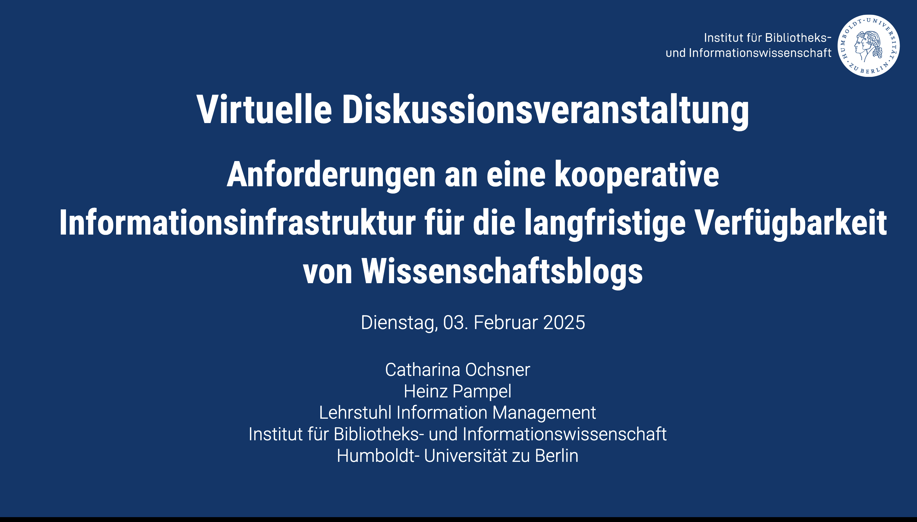 Um diese Probleme anzugehen, wurde im Rahmen des Projekts Infra Wiss Blogs eine virtuelle Diskussionsveranstaltung Blogger:innen und Expert:innen aus Einrichtungen der Informationsinfrastruktur, organisiert. Ziel war es, den im Rahmen des Projekts entwickelten Anforderungskatalog für eine kooperative Informationsinfrastruktur zur langfristigen Verfügbarkeit wissenschaftlicher Blogs vorzustellen und zu diskutieren. Der Katalog basiert auf 13 qualitativen Interviews mit deutschen Wissenschaftsblogger:innen, mit denen deren Anforderungen an eine Informationsinfrastruktur zur Langzeitverfügbarkeit von Wissenschaftsblogs ermittelt werden sollten. Die Diskussion fand in zwei Runden statt. Zunächst konnten Blogger:innen und Expert:innen von Infrastrukturinstitutionen den Katalog mit ihren jeweiligen Kolleg:innen diskutieren, anschließend folgte eine Diskussion im Plenum.